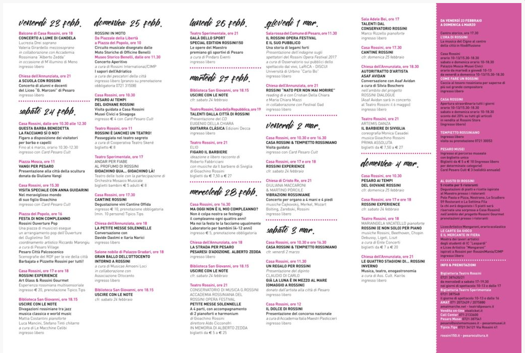 Concerti, spettacoli, laboratori per bambini, percorsi gustativi e incontri animano il programma di ‘Buon non compleanno Rossini‘, un ricco cartellone di iniziative culturali che dà il via ai festeggiamenti dell’anno rossiniano, celebrando i 150 anni dalla morte del Maestro.
